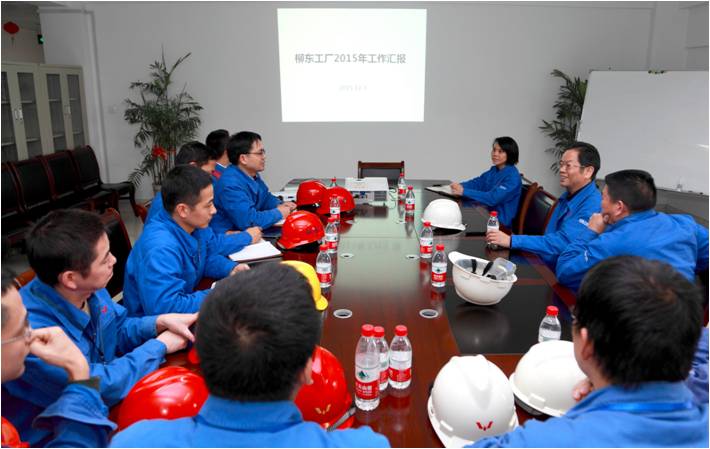 ? ??隨后,韋董一行來到公司柳東工廠進行調研,在參觀生產現場后與柳東管理團隊進行座談。柳東工廠廠長黃輯匯報了2015年柳東工廠運行情況及2016年業務突破。